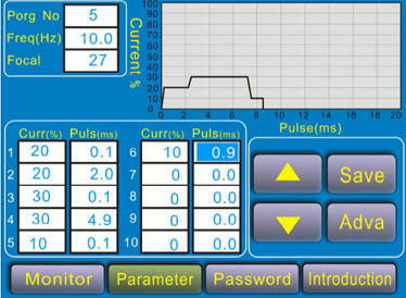 本模具激光焊機(jī)軟件可選擇中文或者英文界面,適合不同國度人員使用。對加工過程中的參數(shù)調(diào)節(jié),配有激光功率值供操作者參考,以便選擇合適的參數(shù)。